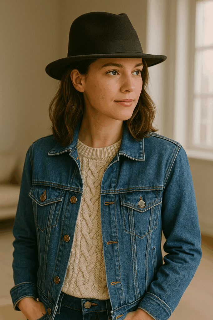 秋口には、濃インディゴデニム(ジーンズ)に濃色ニット、そしてチャコールや焦げ茶のフェルトハットを組み合わせると、ナチュラルながらも統一感のある装いになります。