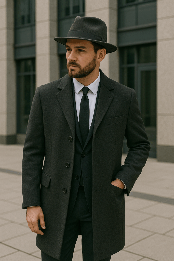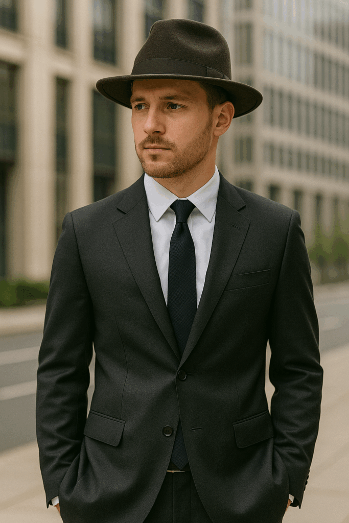 ジャケット・スーツスタイルに合わせる場合は、硬さと形状のしっかりしたフェルトハット(中折れやホンブルグ系)が合います。色は黒・濃灰・ネイビー系が無難。