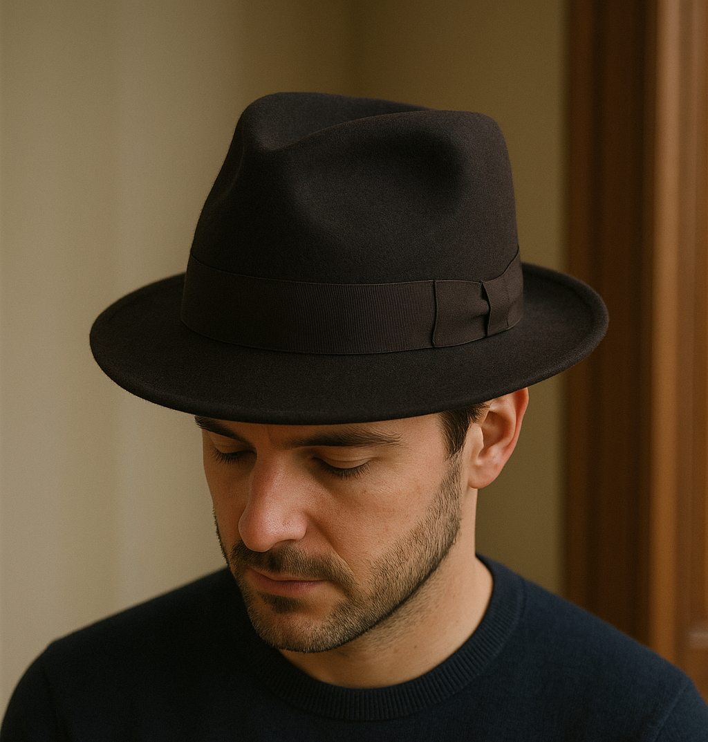 ジャケット・スーツスタイルに合わせる場合は、硬さと形状のしっかりしたフェルトハット(中折れやホンブルグ系)が合います。色は黒・濃灰・ネイビー系が無難。