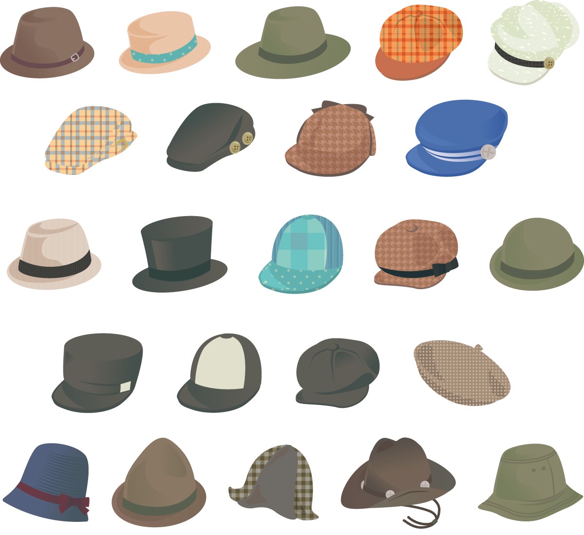 代表的な帽子の呼称:キャップ/バケットハット/ベレー/フェドラ(中折れ)/ボーラ―/キャスケット/ハンチング/ニット帽(ビーニー)/サファリ/ブーニー/パナマなど。